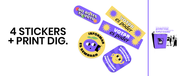 Disponibles 26 de 304 stickers de nuestra y nuestro diseñador, para que pegues en cualquier parte. Además, incluímos el afiche digital más bacán de estas elecciones.