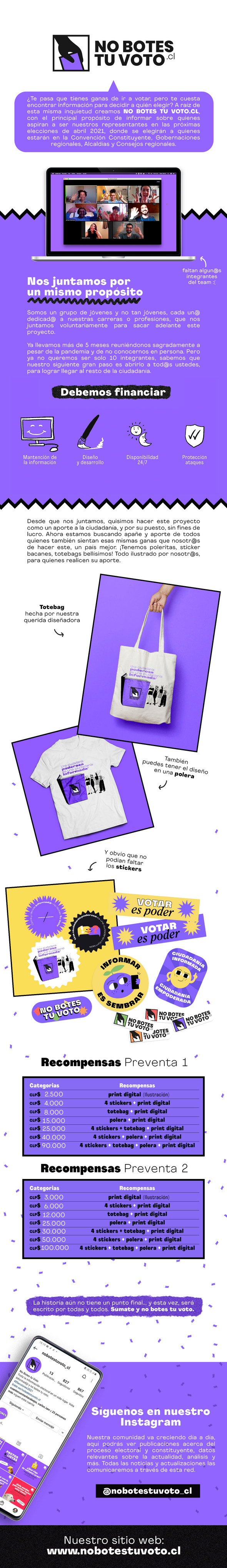 Disponibles 2 de 2Una polera de algodón y 4 stickers de No botes tu voto.cl. Si tienes para echarle ganas y además quieres verte bien, este es tu pack. Además, incluímos el afiche digital más bacán de estas elecciones.